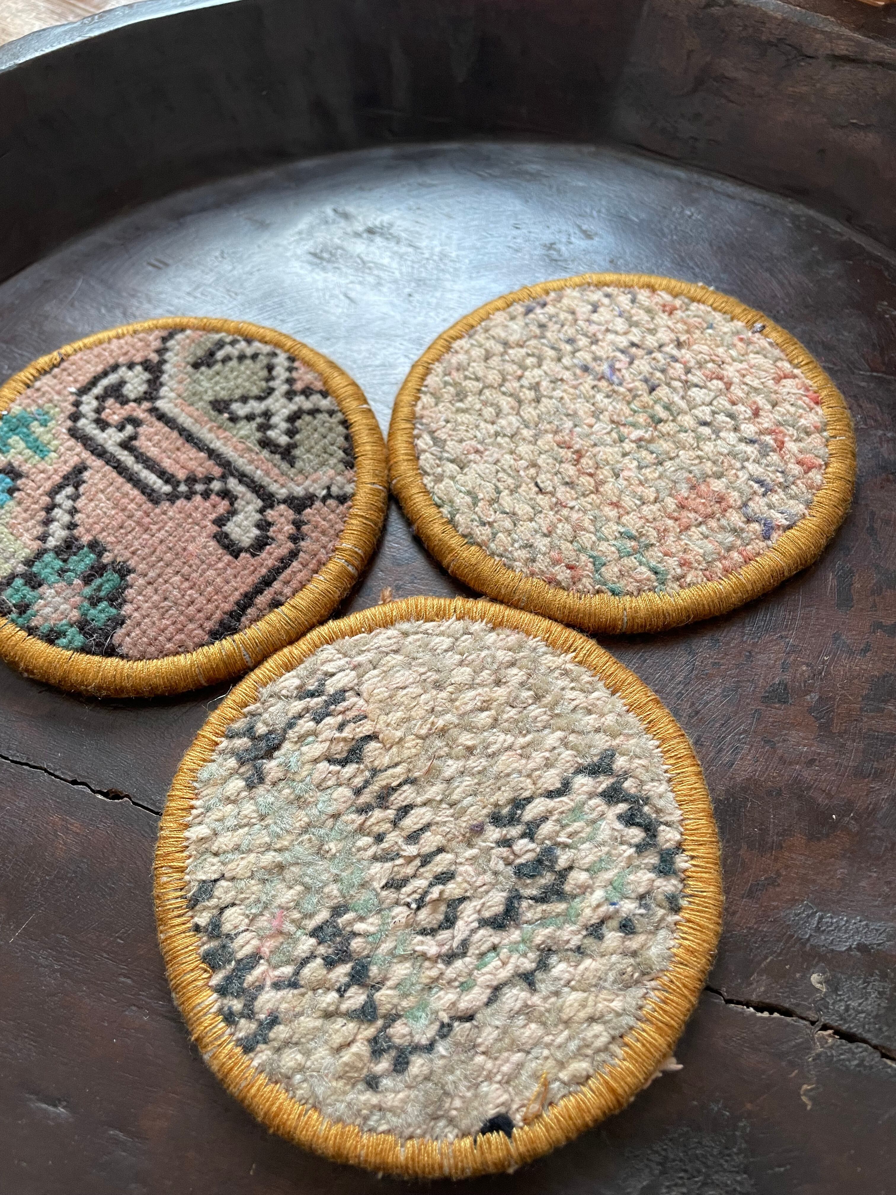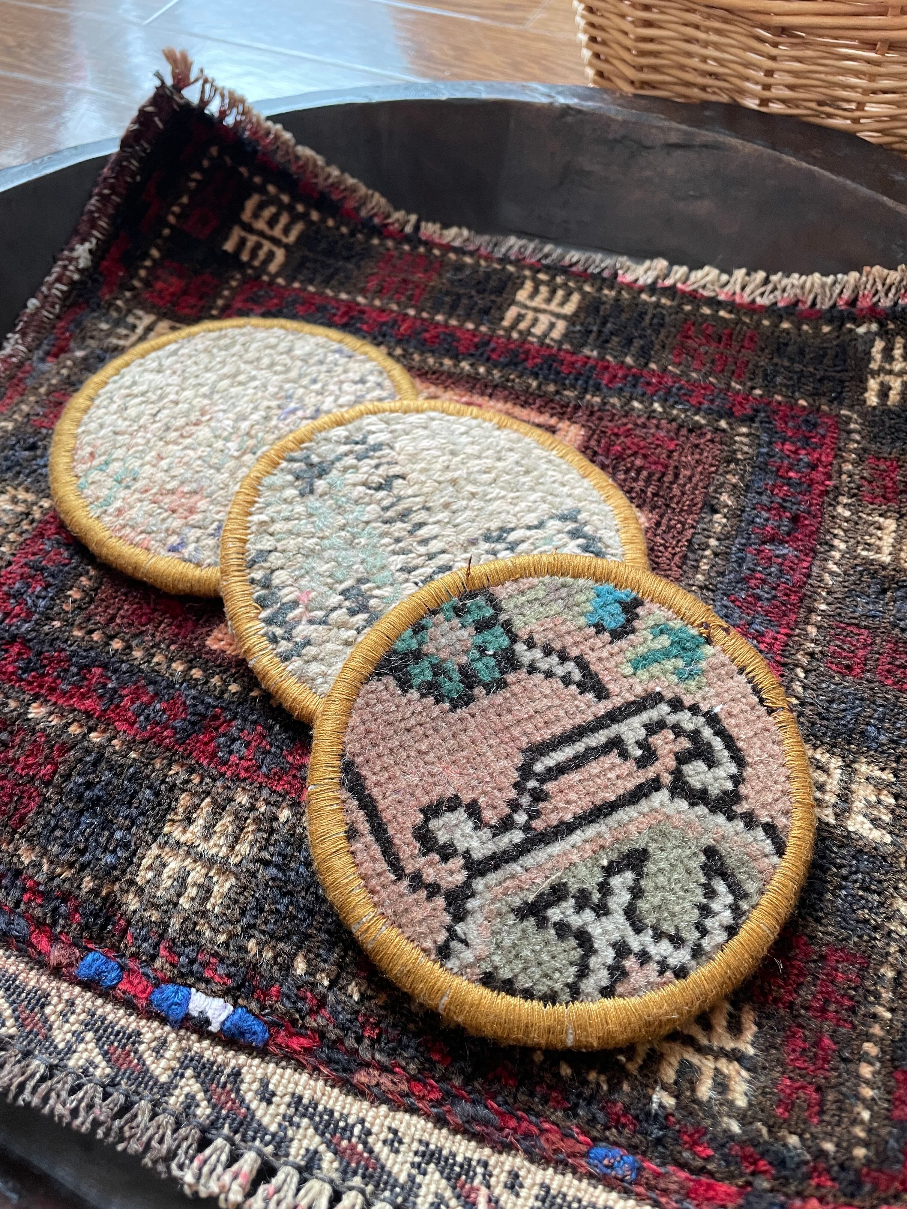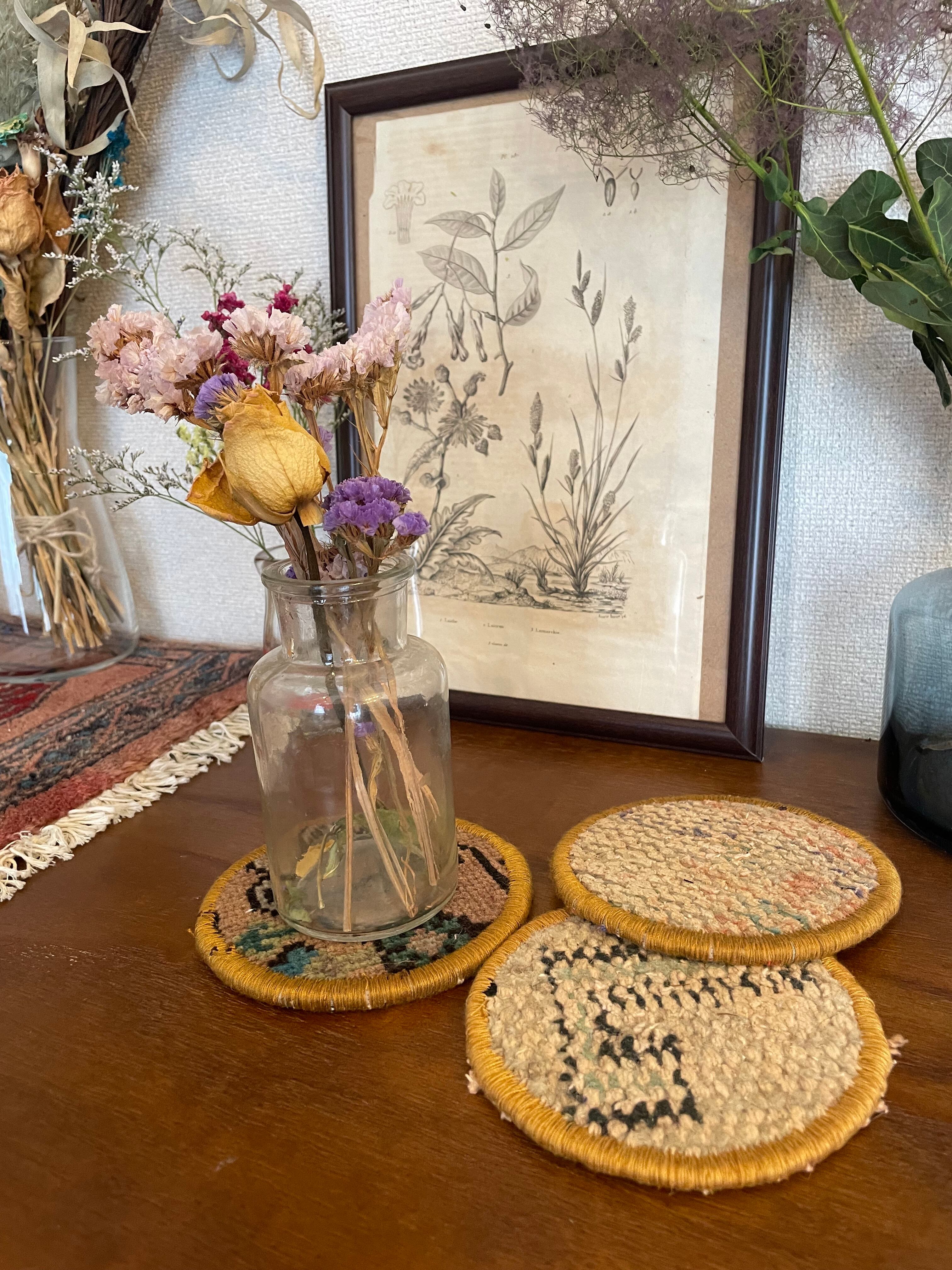 ヴィンテージラグ、キリムで作られたコースターになります✳︎使えなくなったラグの中でも使えるところを切り取りコースターへと生まれ変わったとてもエコな商品です✳︎
